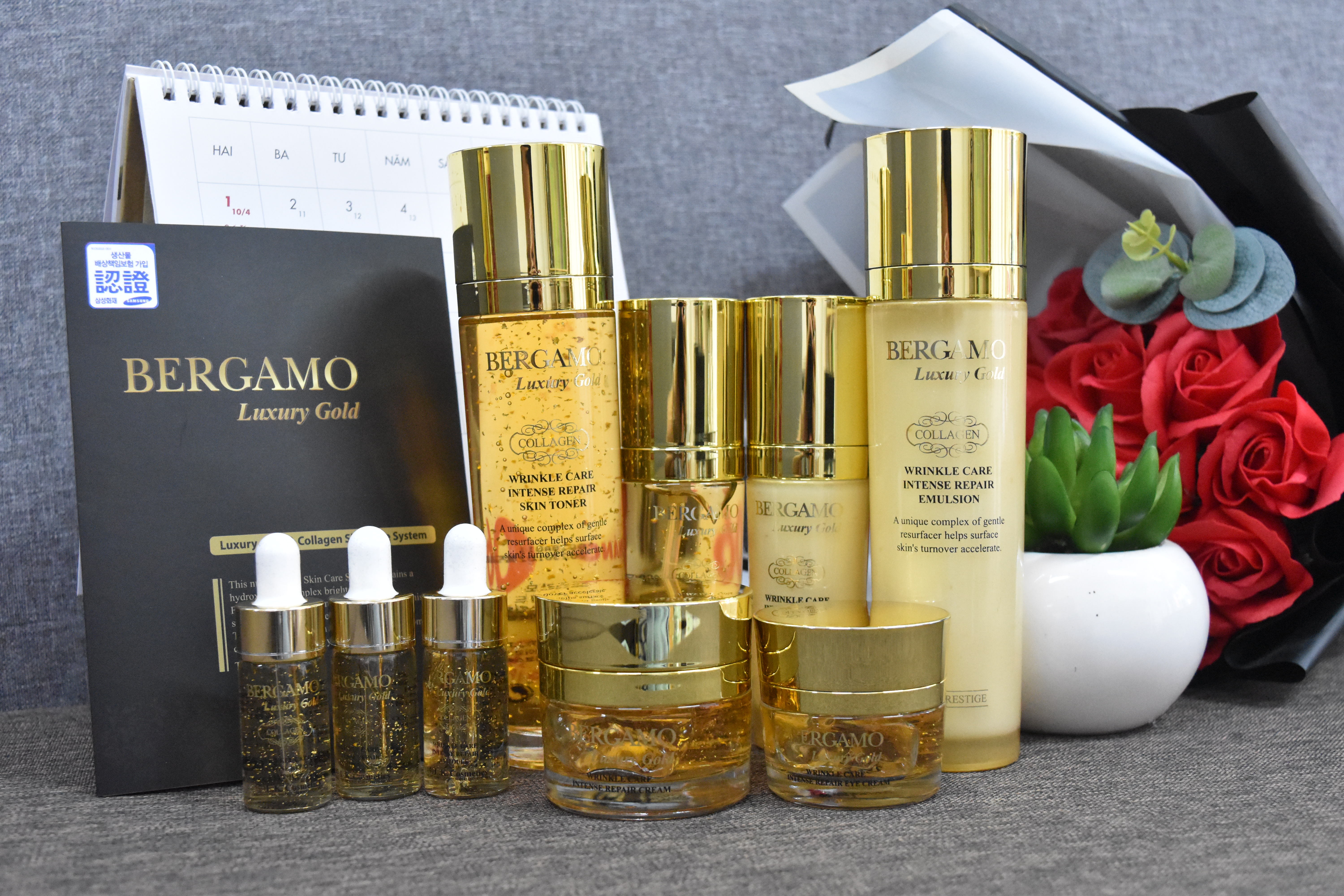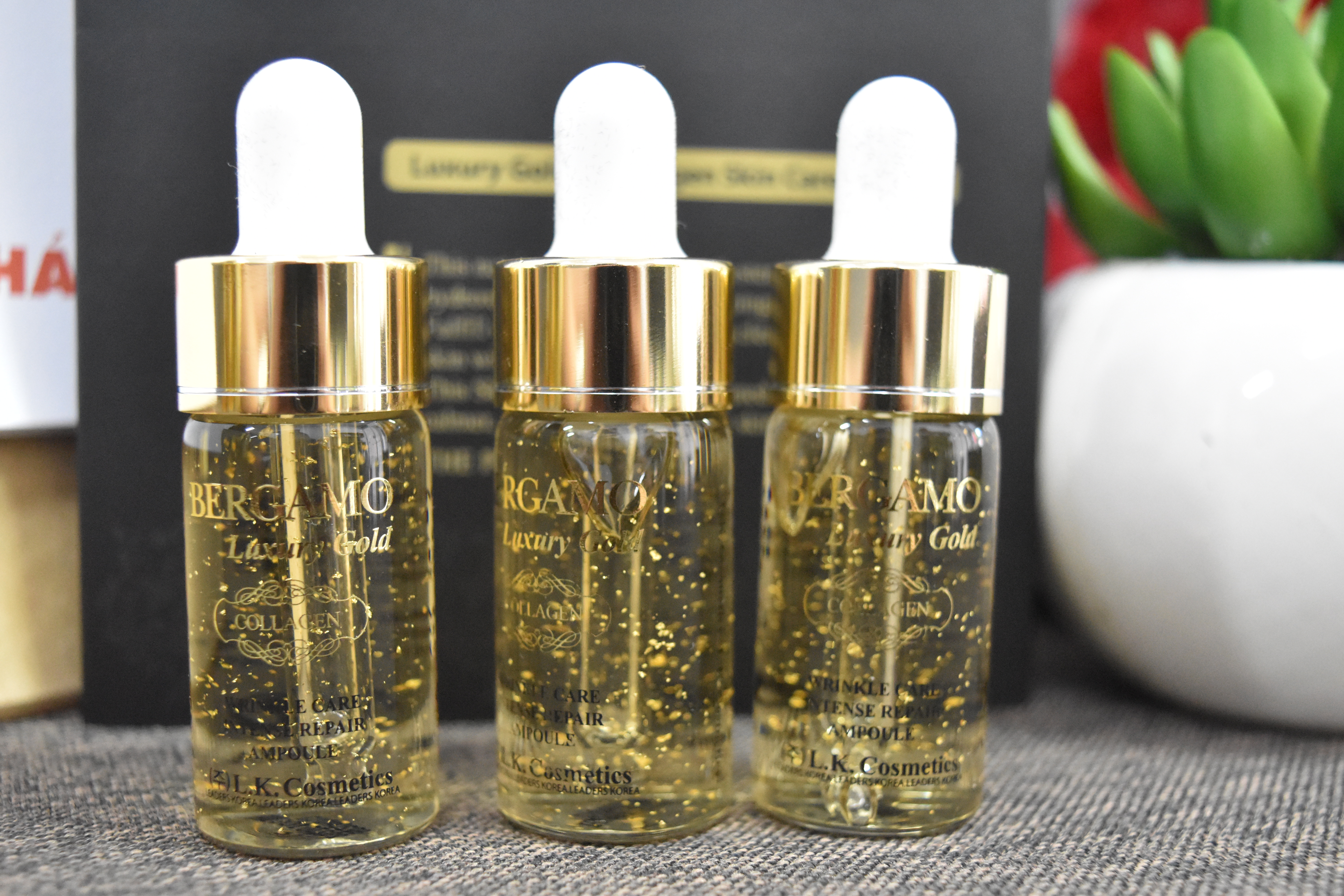 2 Serum Luxury Gold bergamo collagen (chai vàng nhạt): Bổ sung collagen có khả năng tái tạo cấu trúc da, khiến da căng mịn, trẻ hóa.